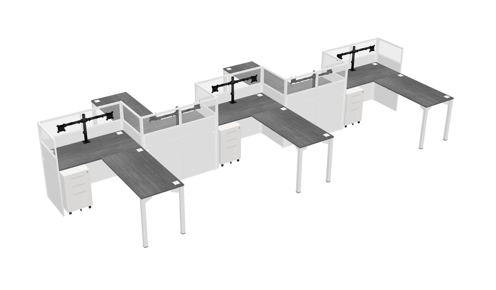 Grey L-shape Cubicle Workstations For 5 - Zigzag Formation + White Metal Mobile Drawers + Panel Return