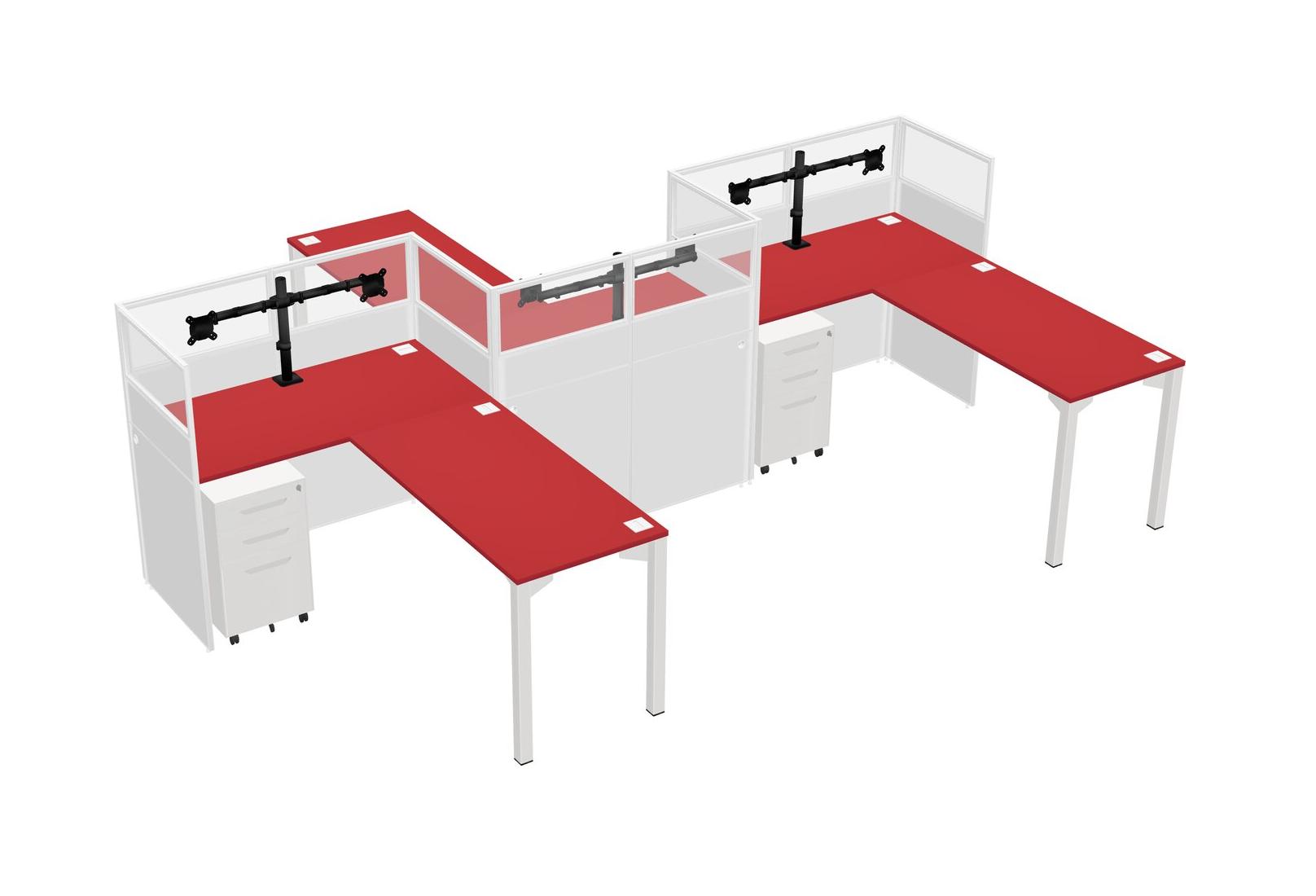 Prism Red L-shape Cubicle Workstations For 3 - Zigzag Formation + White Metal Mobile Drawers + Panel Return