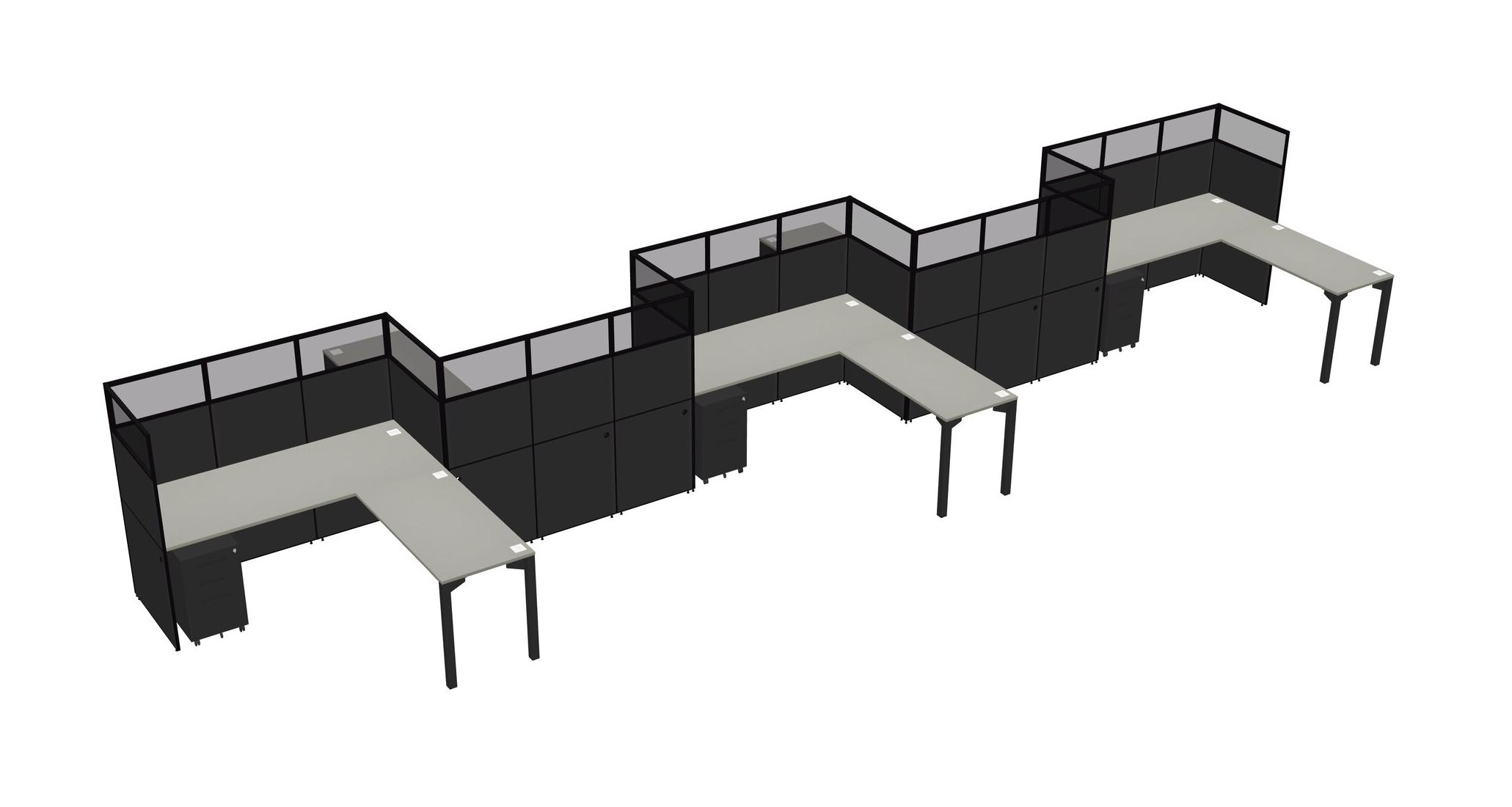 Grey Shadows L-shape Cubicle Workstations For 5 - Zigzag Formation + Black Metal Mobile Drawers + Panel Return