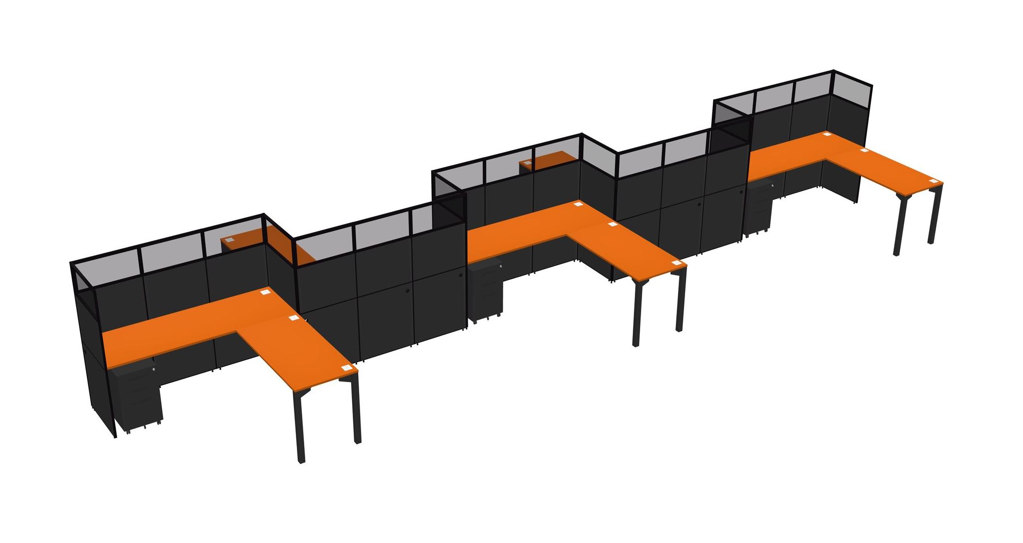 Orange L-shape Cubicle Workstations For 5 - Zigzag Formation + Black Metal Mobile Drawers + Panel Return