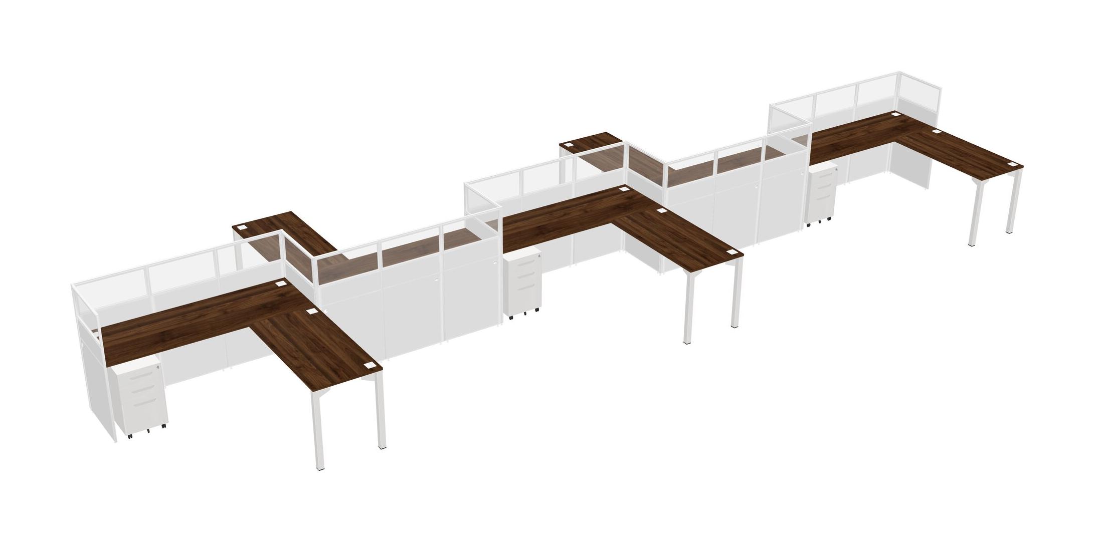 Columbia Walnut L-shape Cubicle Workstations For 5 - Zigzag Formation + White Metal Mobile Drawers + Panel Return