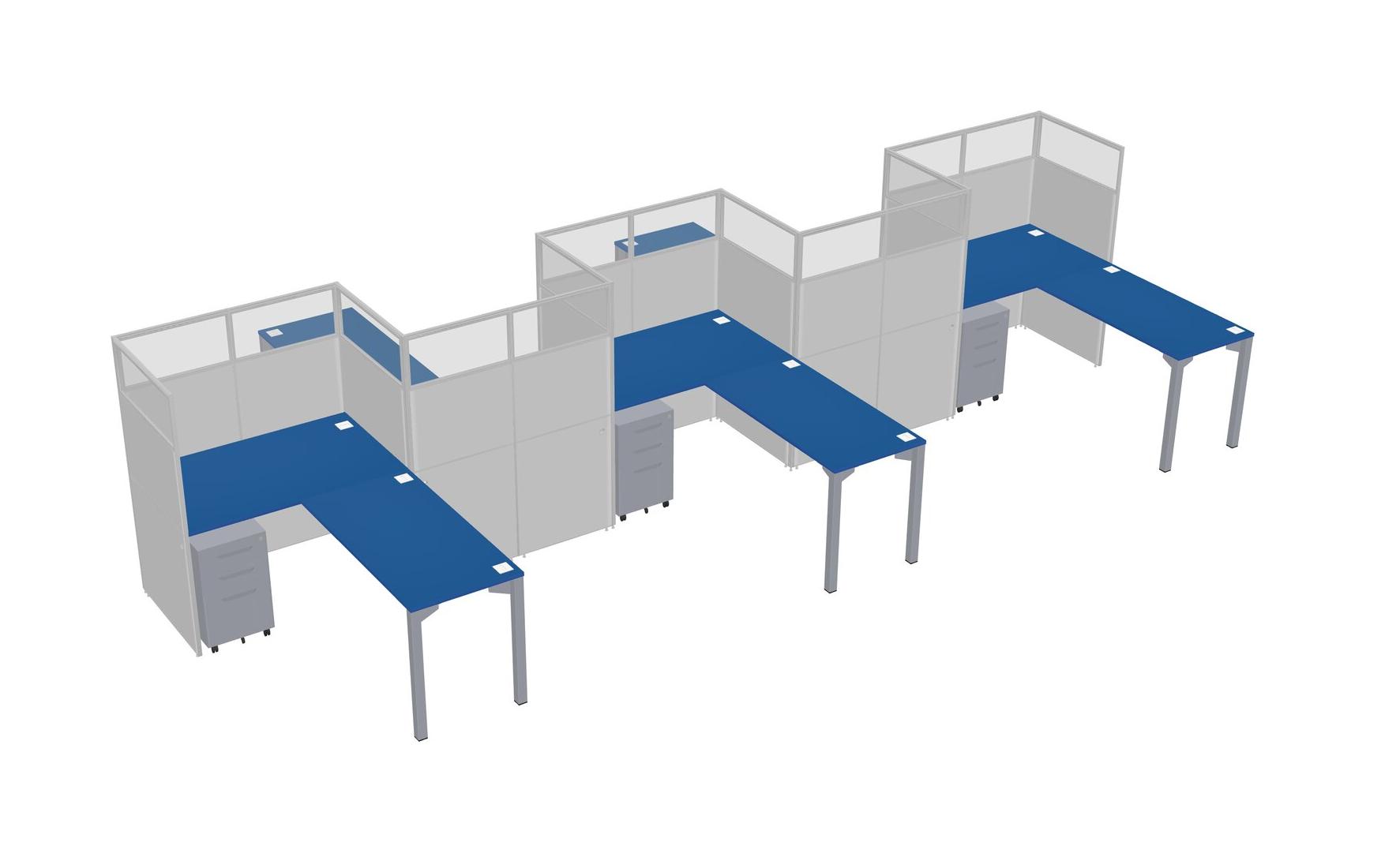 Prism Blue L-shape Cubicle Workstations For 5 - Zigzag Formation + Grey Metal Mobile Drawers + Panel Return