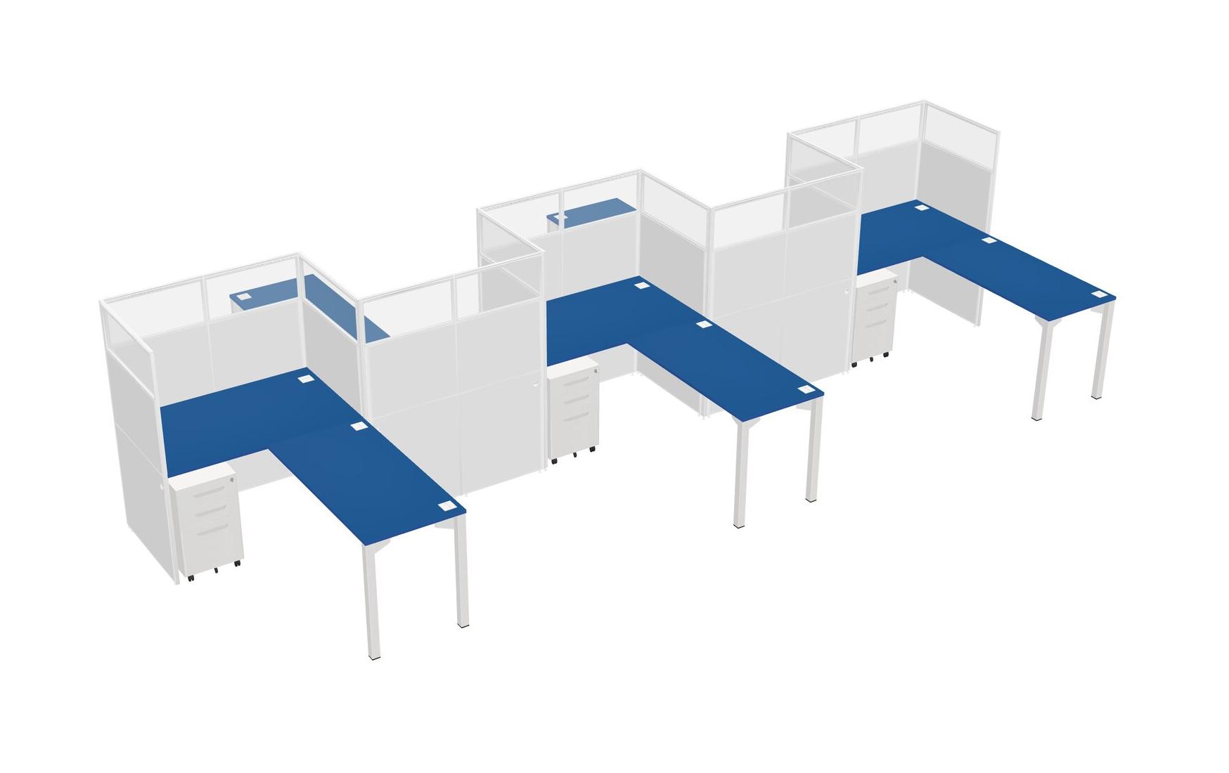 Prism Blue L-shape Cubicle Workstations For 5 - Zigzag Formation + White Metal Mobile Drawers + Panel Return