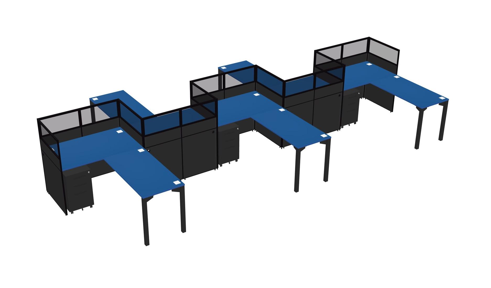Prism Blue L-shape Cubicle Workstations For 5 - Zigzag Formation + Black Metal Mobile Drawers + Panel Return