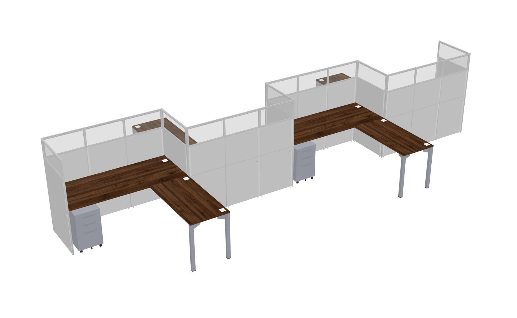 Columbia Walnut L-shape Cubicle Workstations For 4 - Zigzag Formation + Grey Metal Mobile Drawers + Panel Return