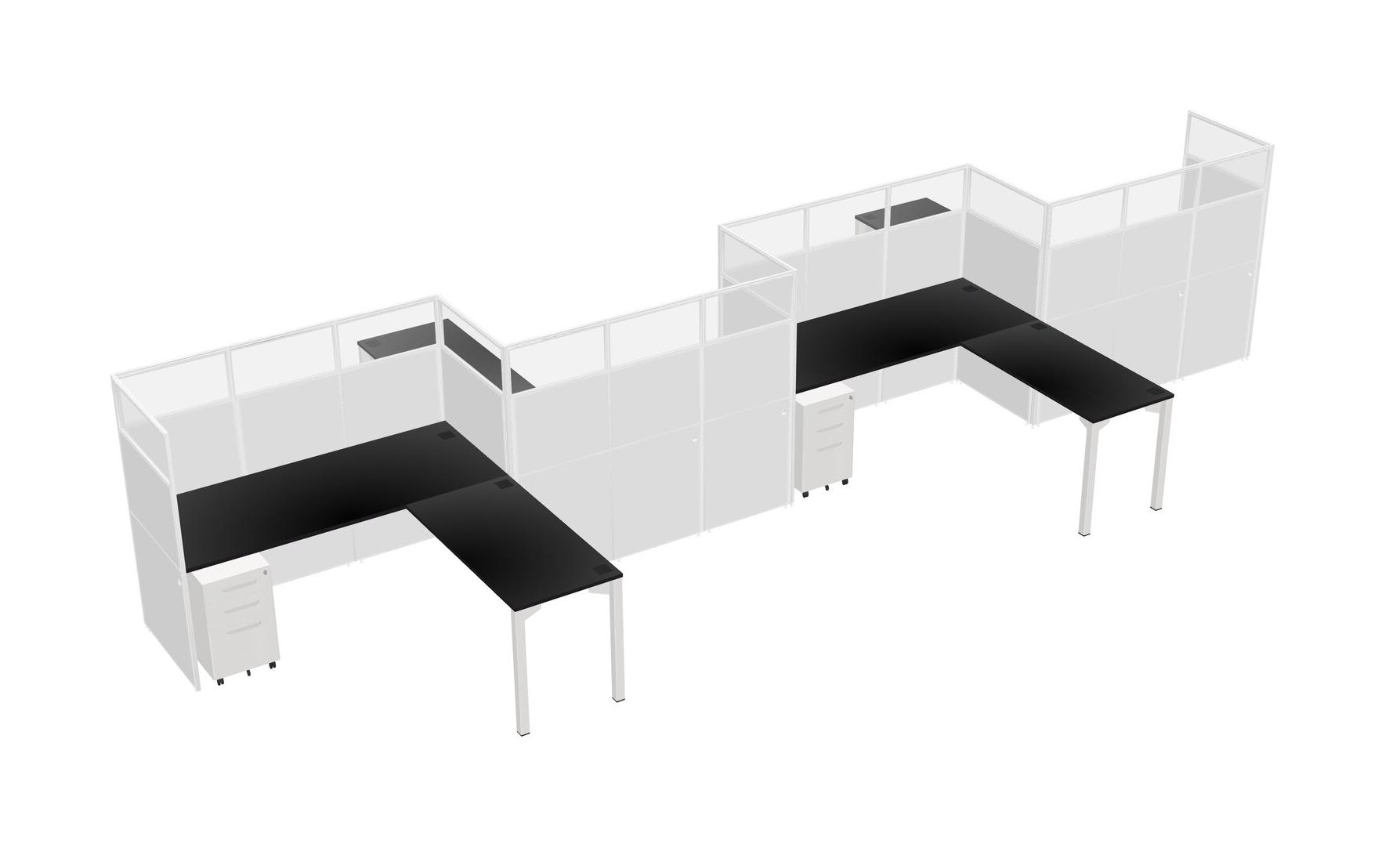 Black L-shape Cubicle Workstations For 4 - Zigzag Formation + White Metal Mobile Drawers + Panel Return