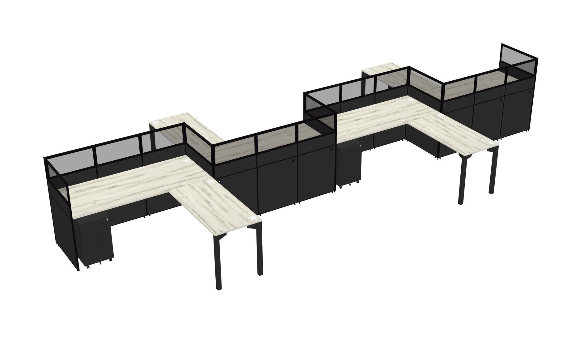 Heinne Holz L-shape Cubicle Workstations For 4 - Zigzag Formation + Black Metal Mobile Drawers + Panel Return