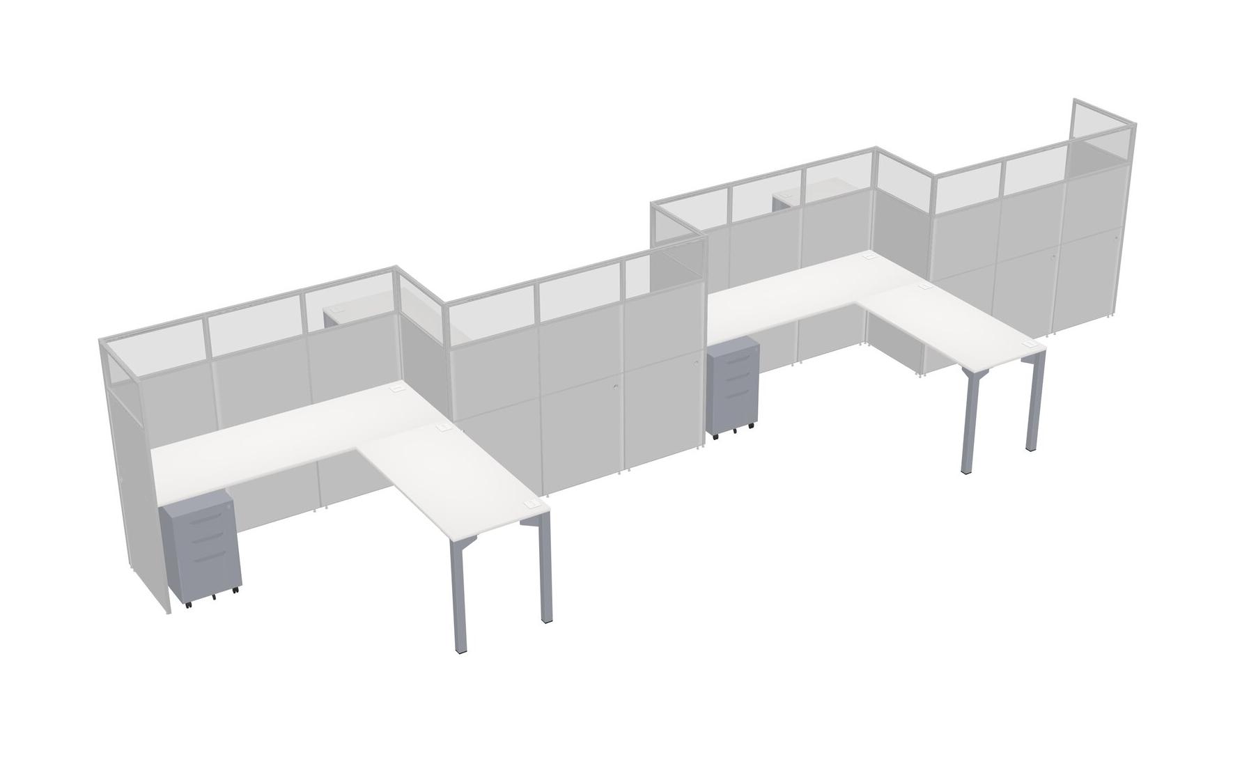 White L-shape Cubicle Workstations For 4 - Zigzag Formation + Grey Metal Mobile Drawers + Panel Return