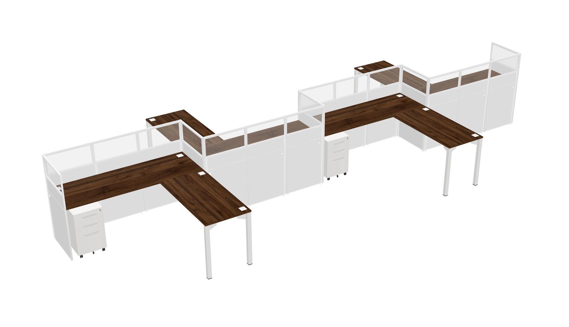 Columbia Walnut L-shape Cubicle Workstations For 4 - Zigzag Formation + White Metal Mobile Drawers + Panel Return