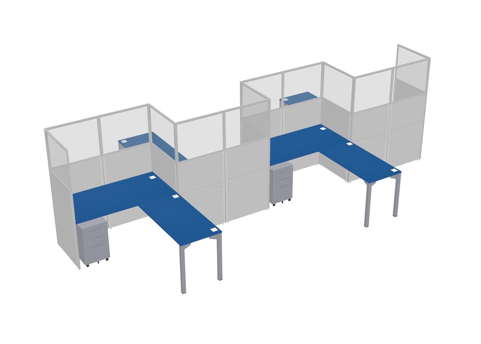 Prism Blue L-shape Cubicle Workstations For 4 - Zigzag Formation + Grey Metal Mobile Drawers + Panel Return