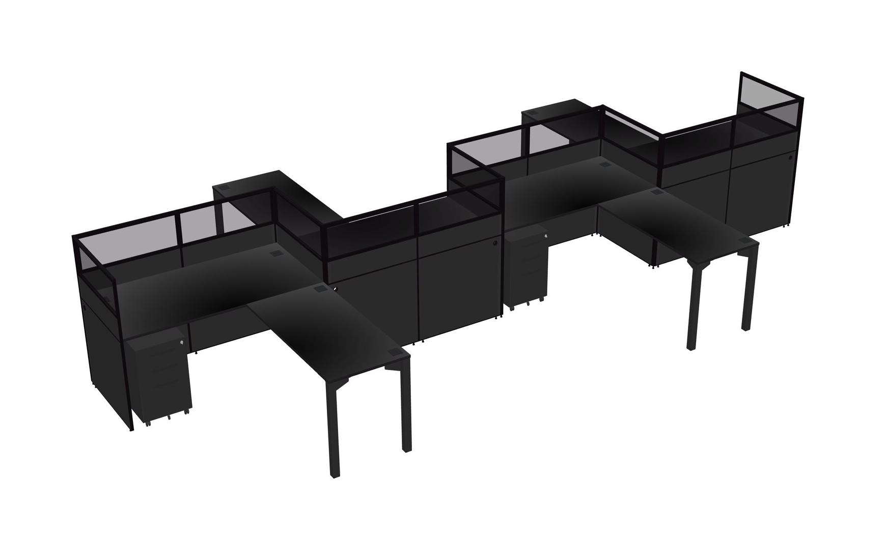Black L-shape Cubicle Workstations For 4 - Zigzag Formation + Black Metal Mobile Drawers + Panel Return