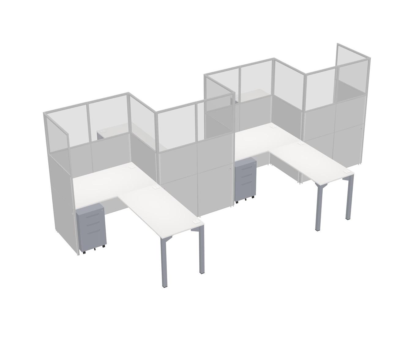 White L-shape Cubicle Workstations For 4 - Zigzag Formation + Grey Metal Mobile Drawers + Panel Return