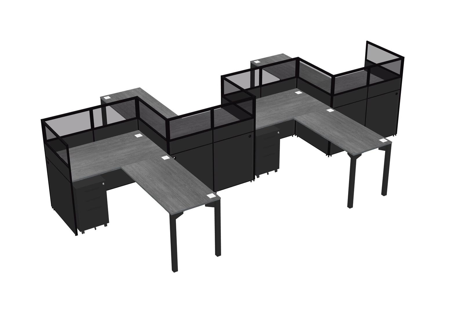 Grey L-shape Cubicle Workstations For 4 - Zigzag Formation + Black Metal Mobile Drawers + Panel Return