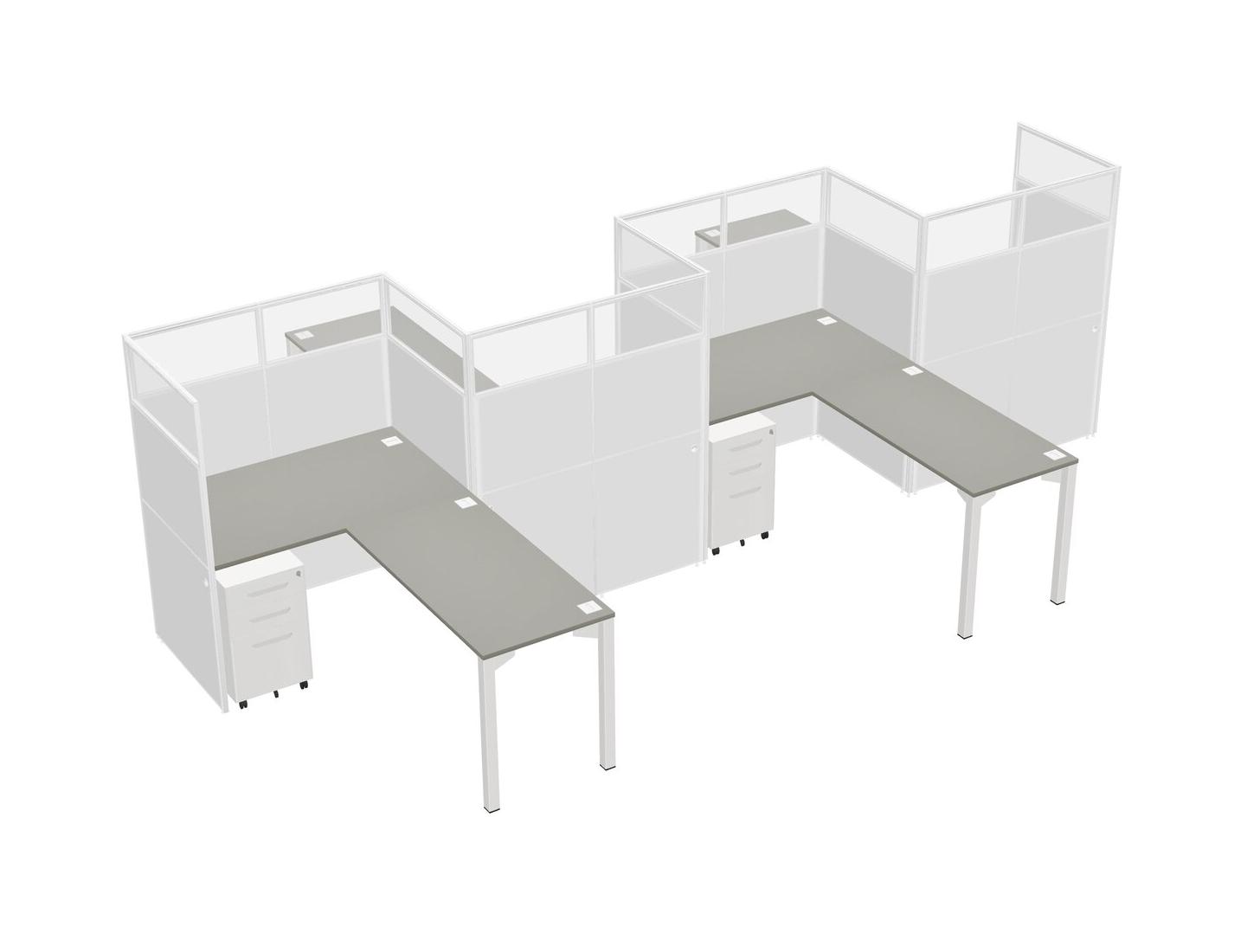 Grey Shadows L-shape Cubicle Workstations For 4 - Zigzag Formation + White Metal Mobile Drawers + Panel Return