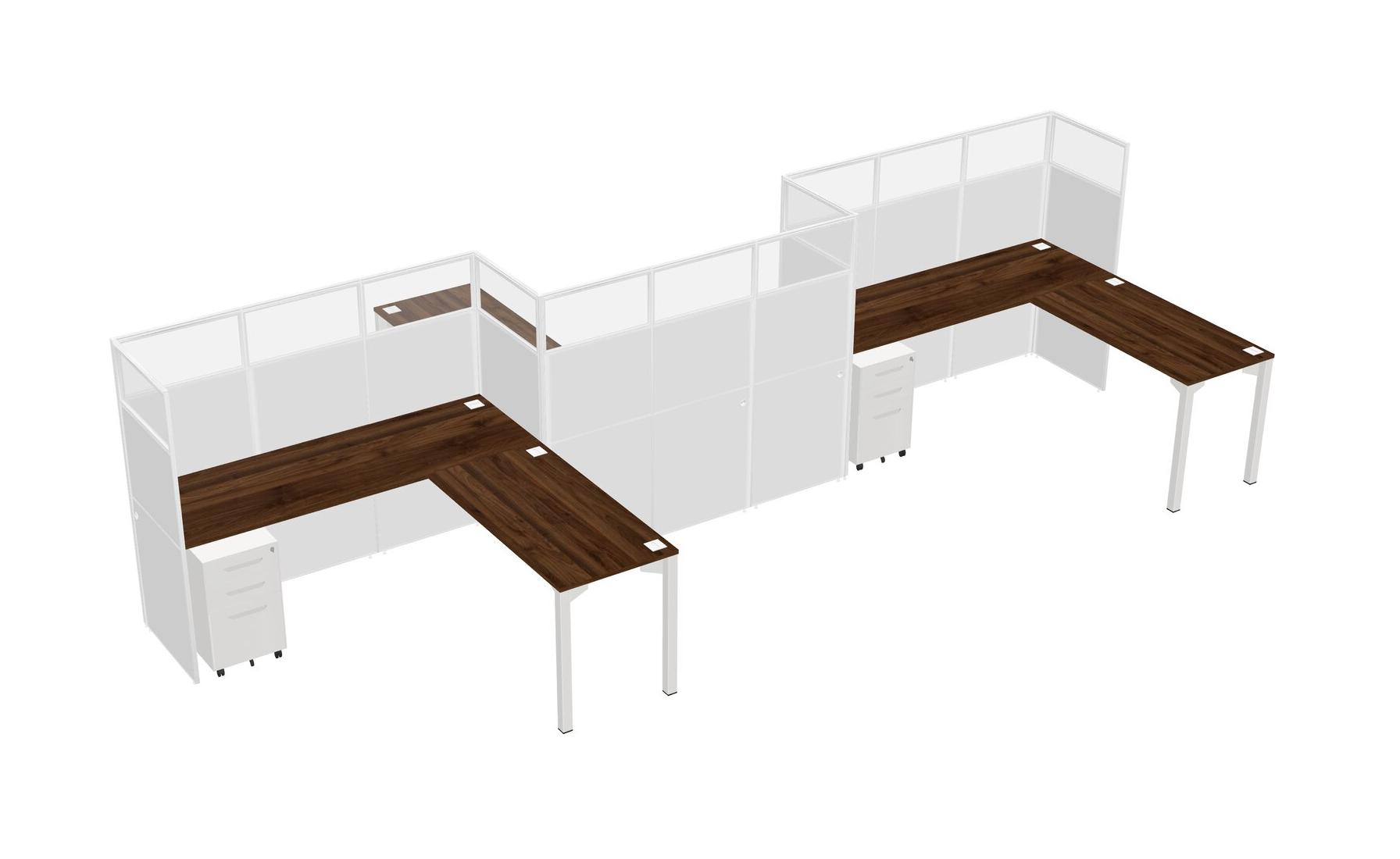 Columbia Walnut L-shape Cubicle Workstations For 3 - Zigzag Formation + White Metal Mobile Drawers + Panel Return