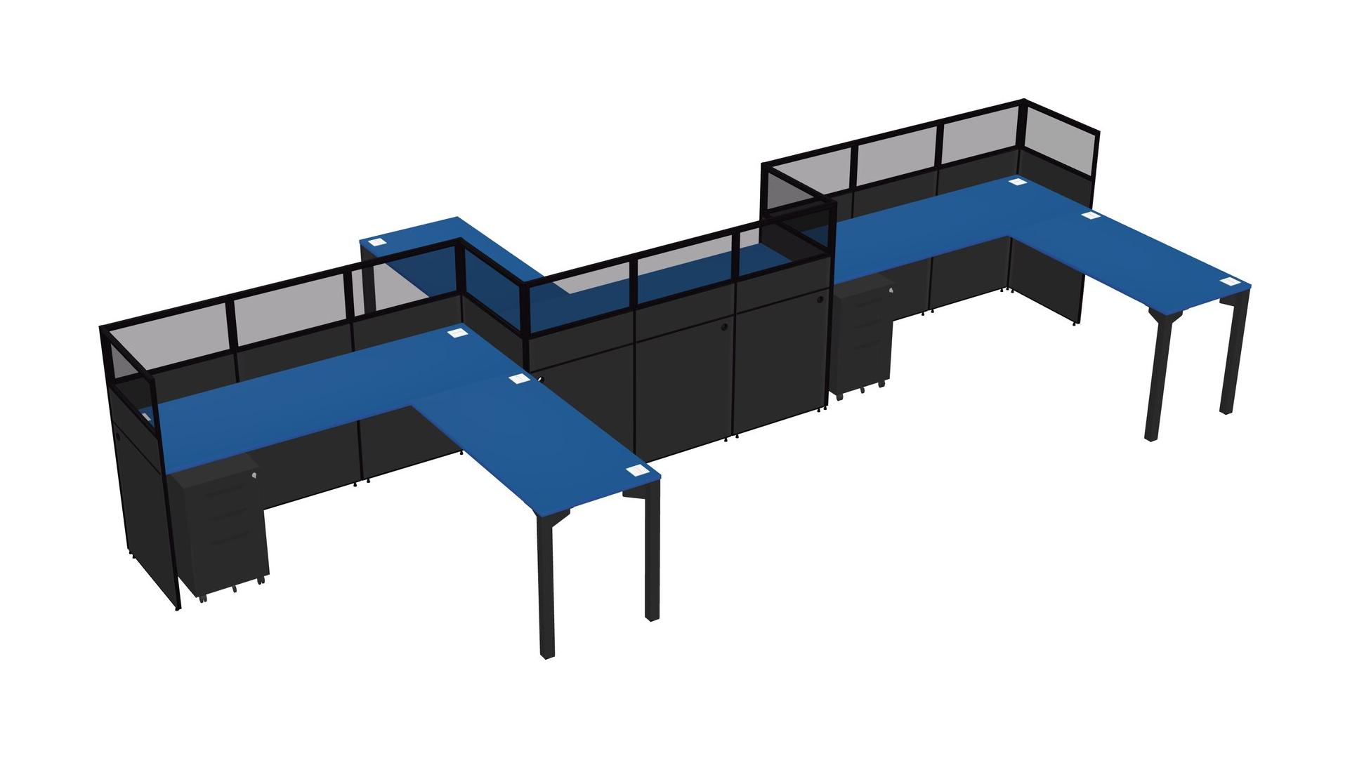 Prism Blue L-shape Cubicle Workstations For 3 - Zigzag Formation + Black Metal Mobile Drawers + Panel Return