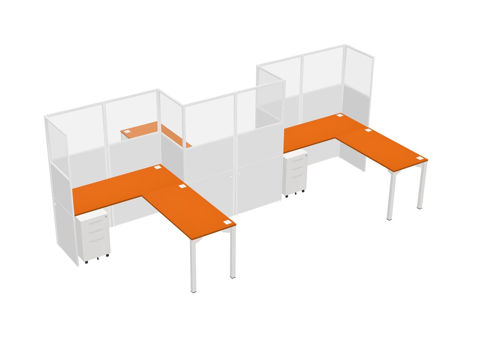 Orange L-shape Cubicle Workstations For 3 - Zigzag Formation + White Metal Mobile Drawers + Panel Return