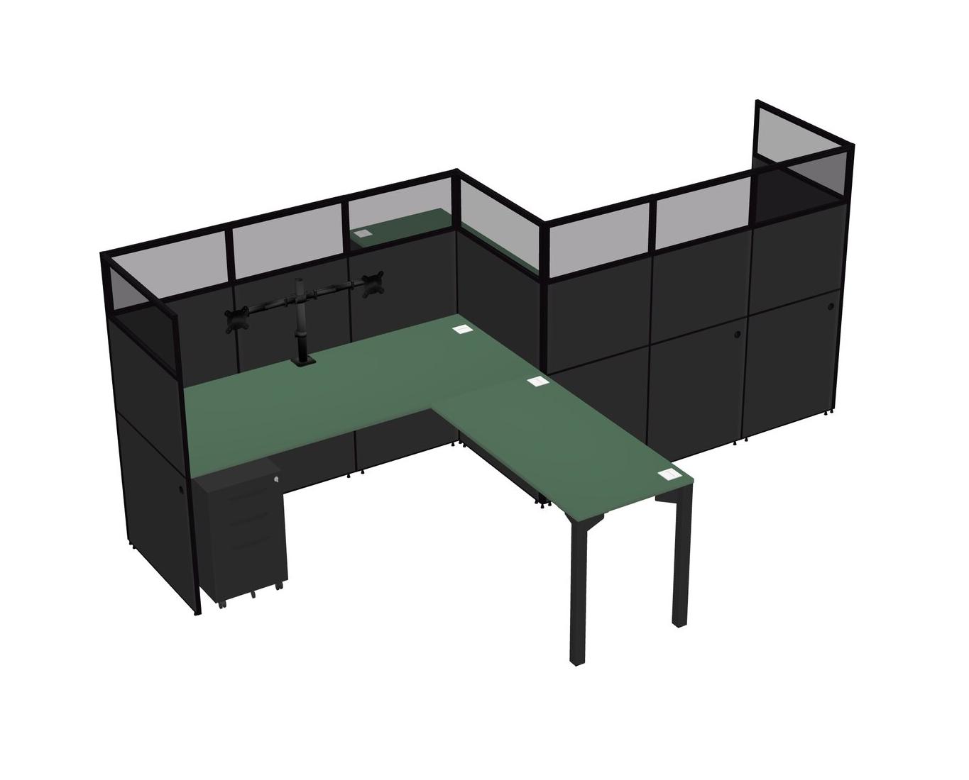 Green L-shape Cubicle Workstations For 2 - Zigzag Formation + Black Metal Mobile Drawers + Panel Return