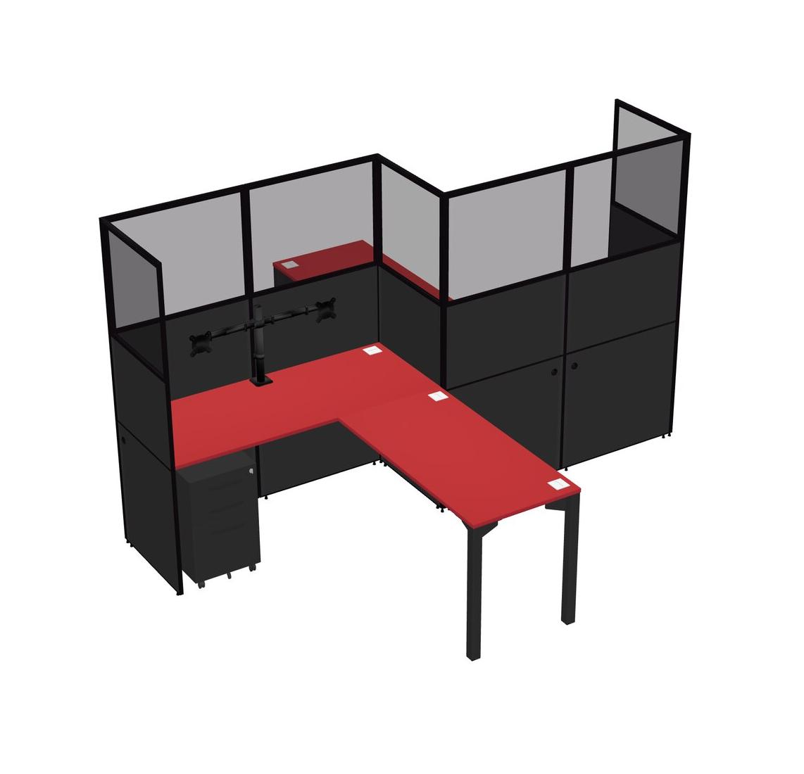 Prism Red L-shape Cubicle Workstations For 2 - Zigzag Formation + Black Metal Mobile Drawers + Panel Return