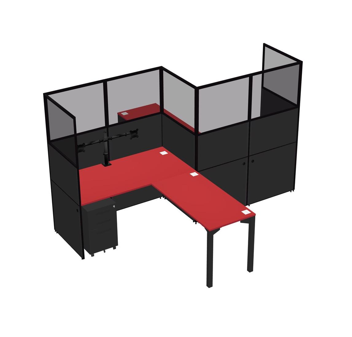 Prism Red L-shape Cubicle Workstations For 2 - Zigzag Formation + Black Metal Mobile Drawers + Panel Return