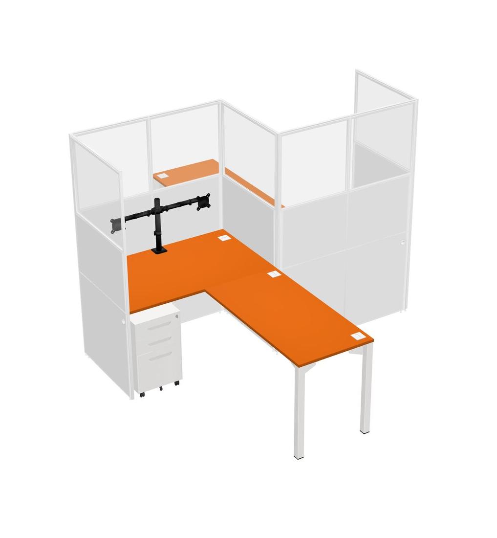 Orange L-shape Cubicle Workstations For 2 - Zigzag Formation + White Metal Mobile Drawers + Panel Return