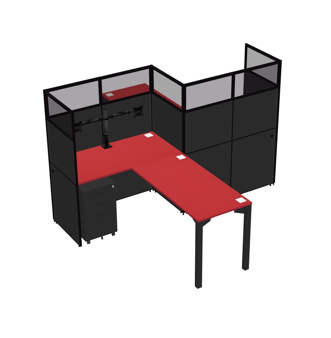 Prism Red L-shape Cubicle Workstations For 2 - Zigzag Formation + Black Metal Mobile Drawers + Panel Return