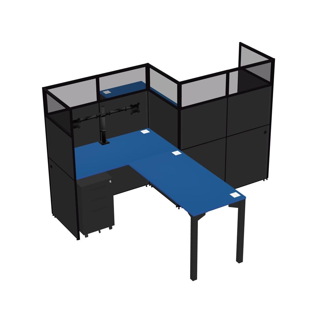 Prism Blue L-shape Cubicle Workstations For 2 - Zigzag Formation + Black Metal Mobile Drawers + Panel Return
