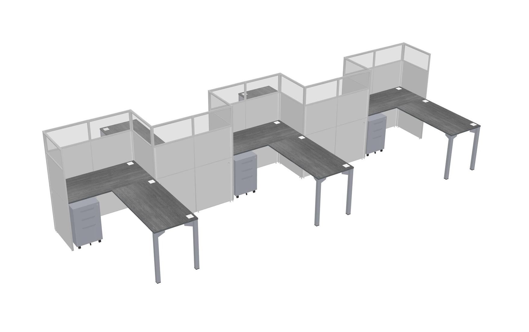 Grey L-shape Cubicle Workstations For 5 - Zigzag Formation + Grey Metal Mobile Drawers + Panel Return