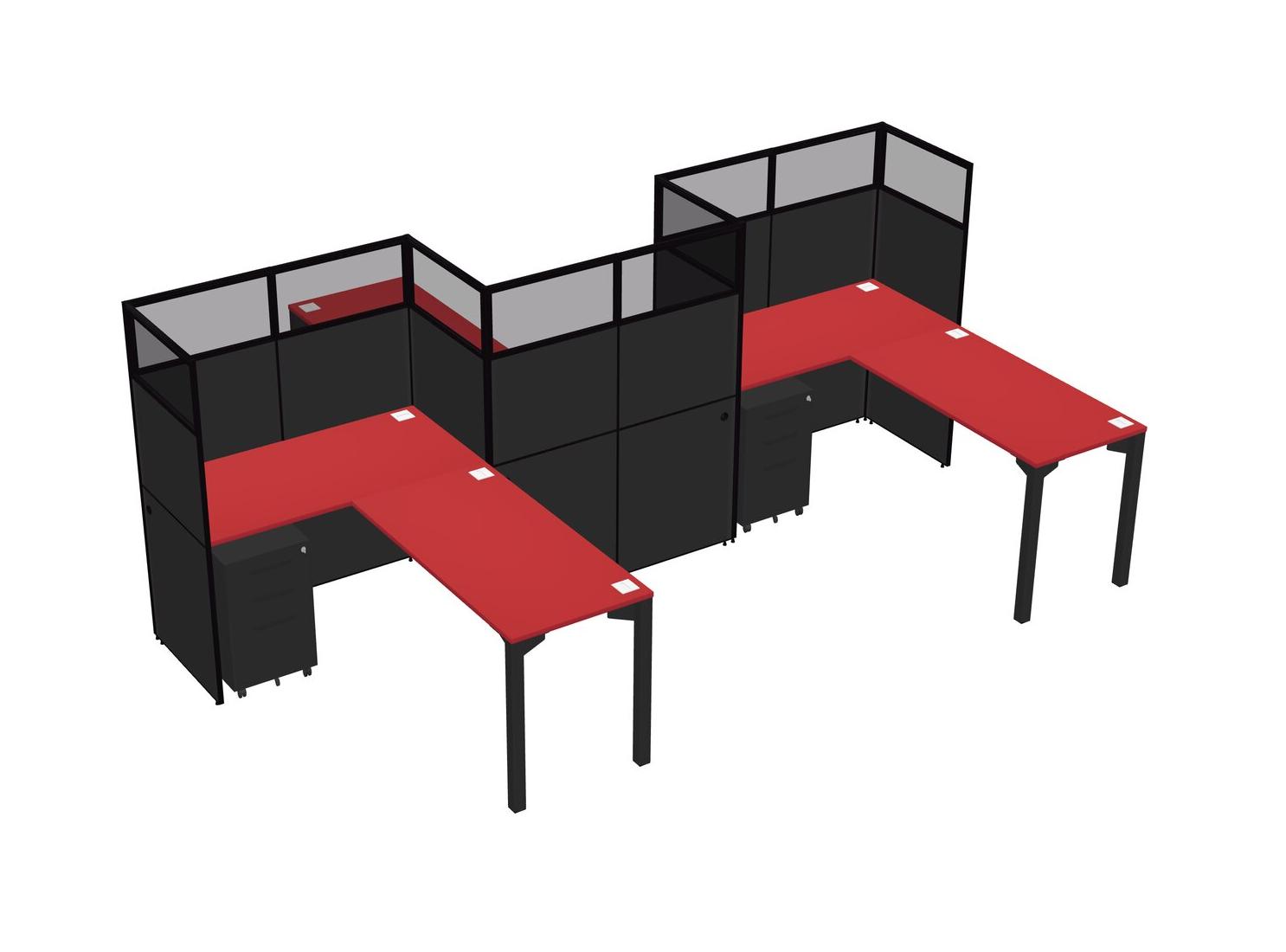 Prism Red L-shape Cubicle Workstations For 3 - Zigzag Formation + Black Metal Mobile Drawers + Panel Return