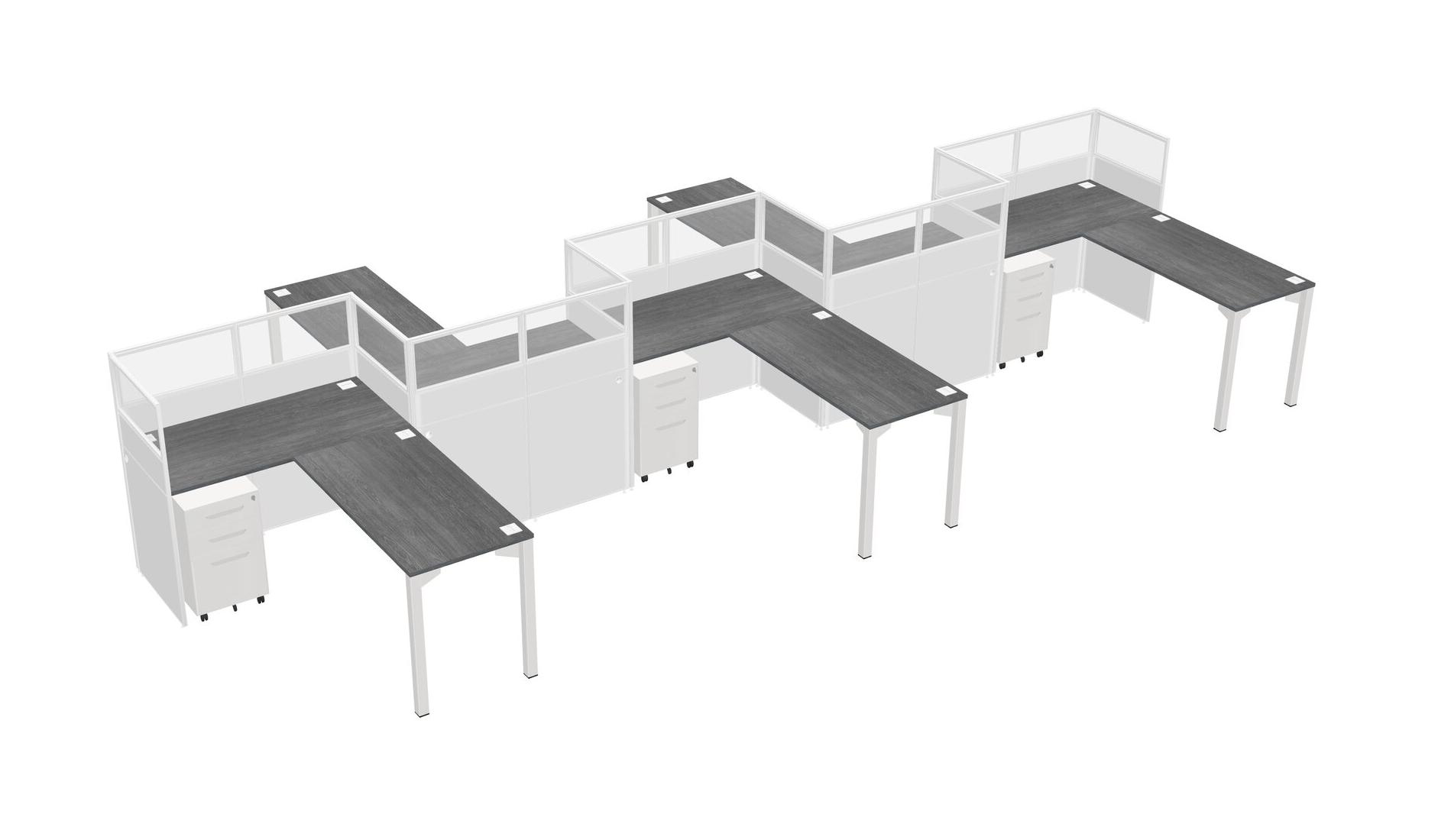 Grey L-shape Cubicle Workstations For 5 - Zigzag Formation + White Metal Mobile Drawers + Panel Return