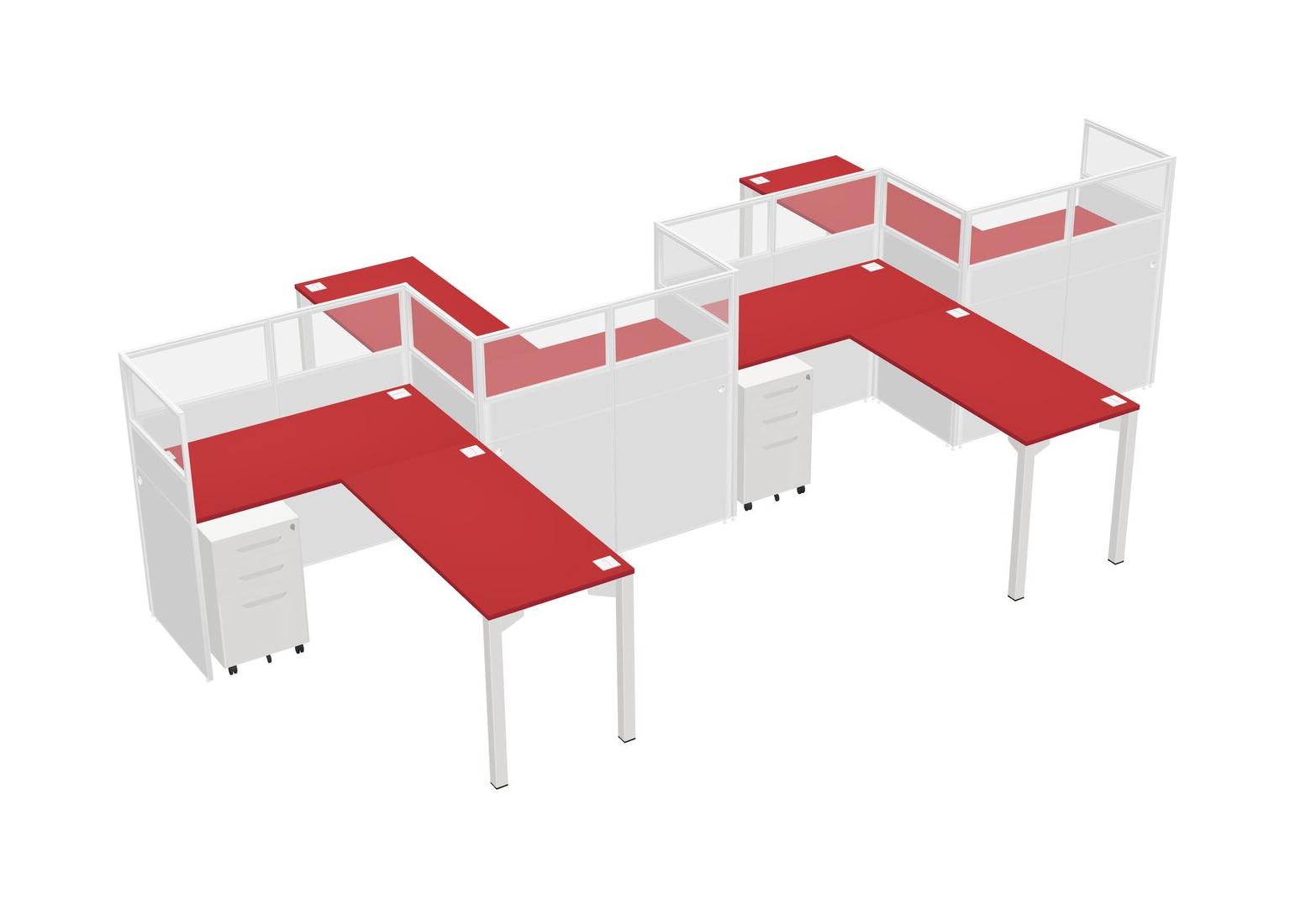 Prism Red L-shape Cubicle Workstations For 4 - Zigzag Formation + White Metal Mobile Drawers + Panel Return
