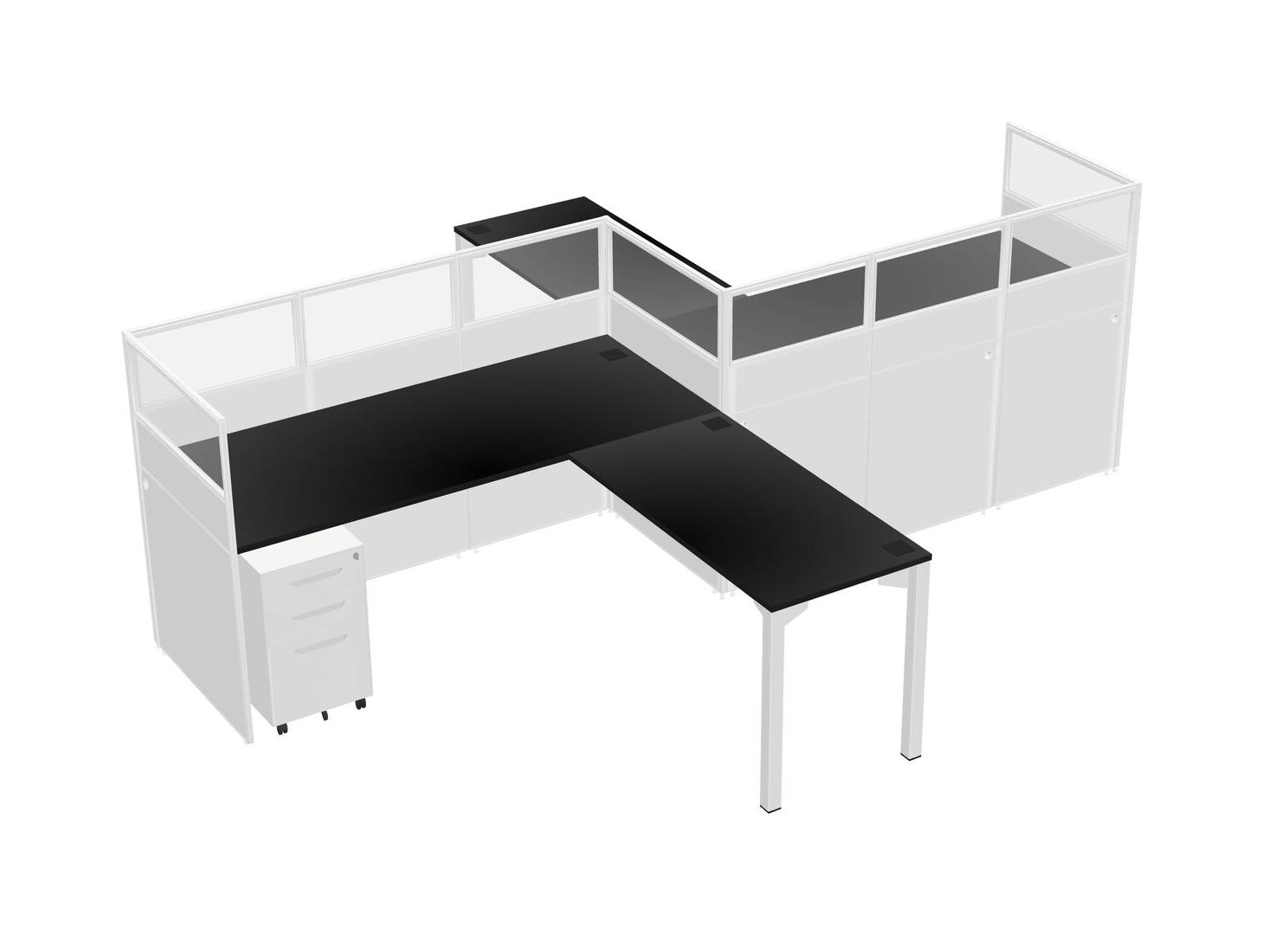 Black L-shape Cubicle Workstations For 2 - Zigzag Formation + White Metal Mobile Drawers + Panel Return