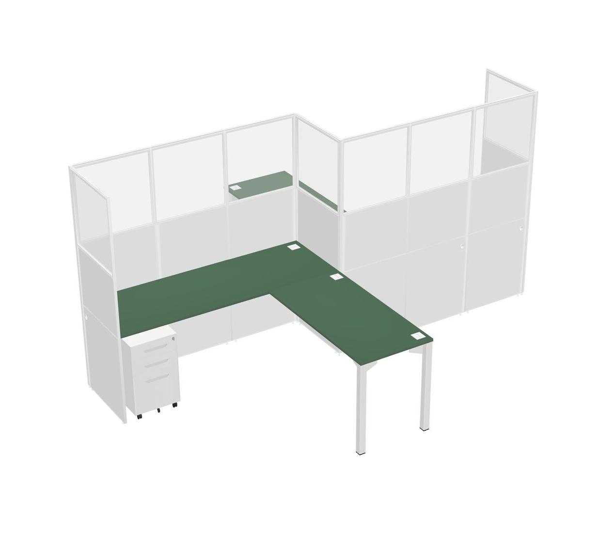 Green L-shape Cubicle Workstations For 2 - Zigzag Formation + White Metal Mobile Drawers + Panel Return