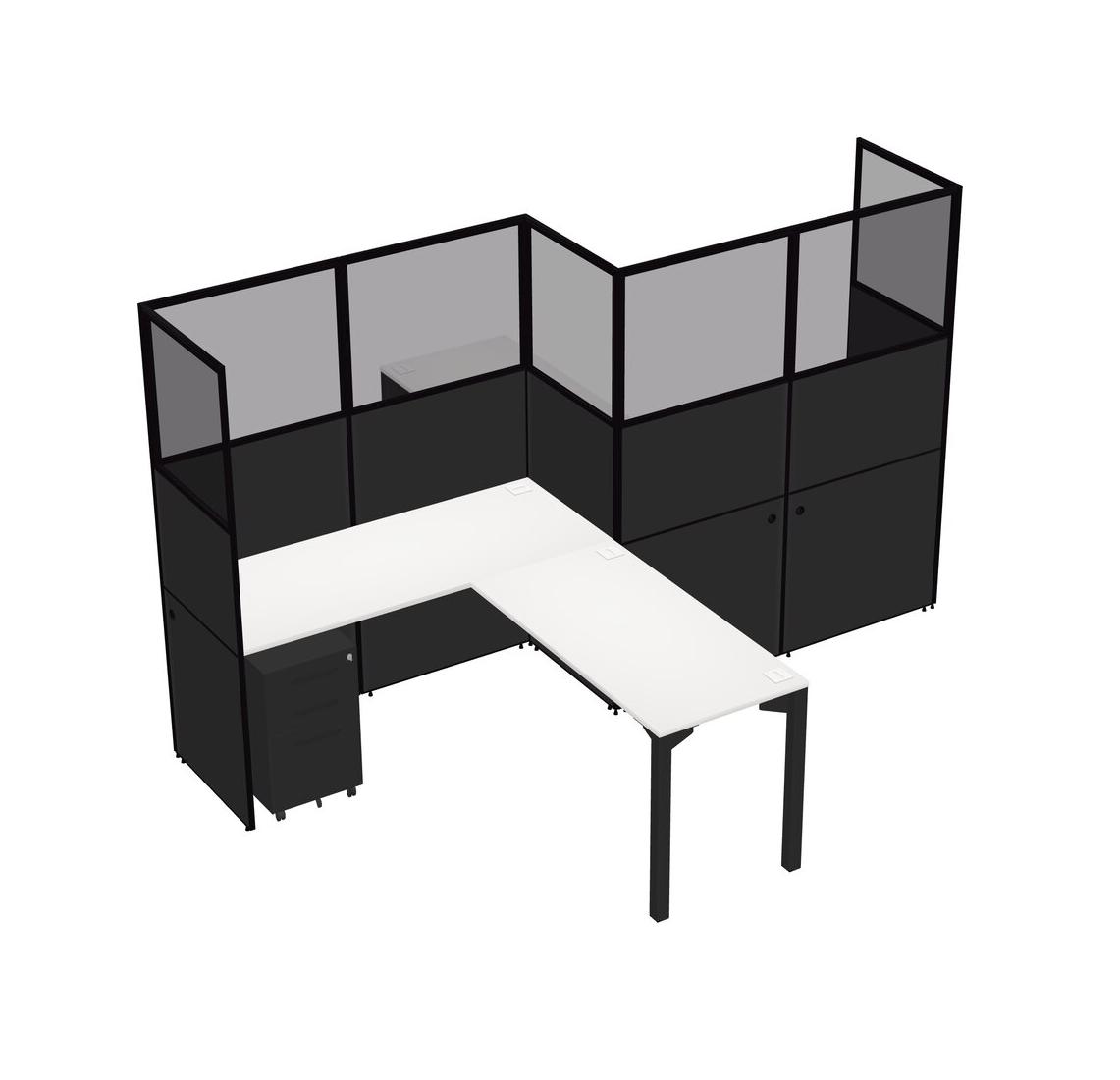 White L-shape Cubicle Workstations For 2 - Zigzag Formation + Black Metal Mobile Drawers + Panel Return