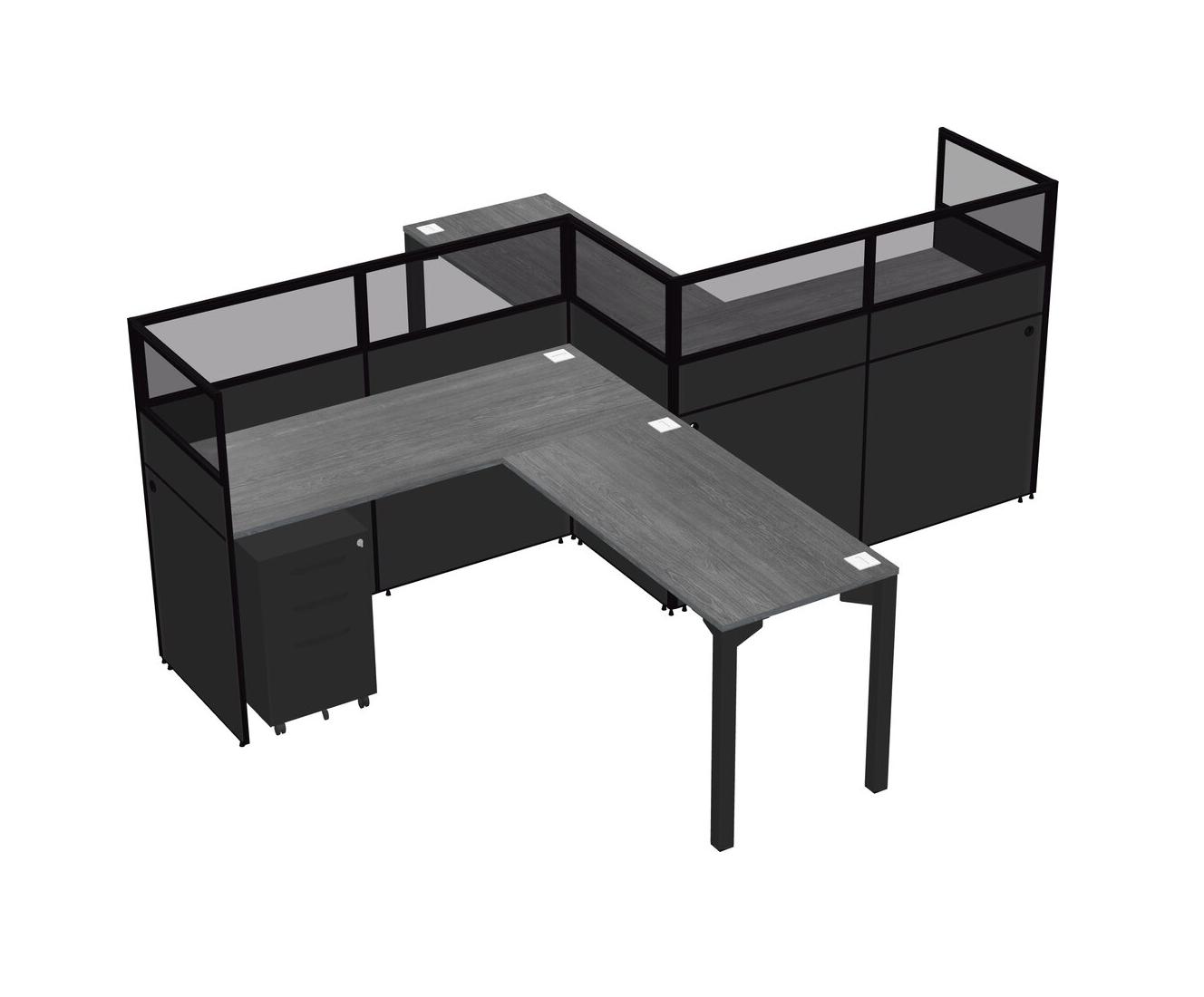 Grey L-shape Cubicle Workstations For 2 - Zigzag Formation + Black Metal Mobile Drawers + Panel Return
