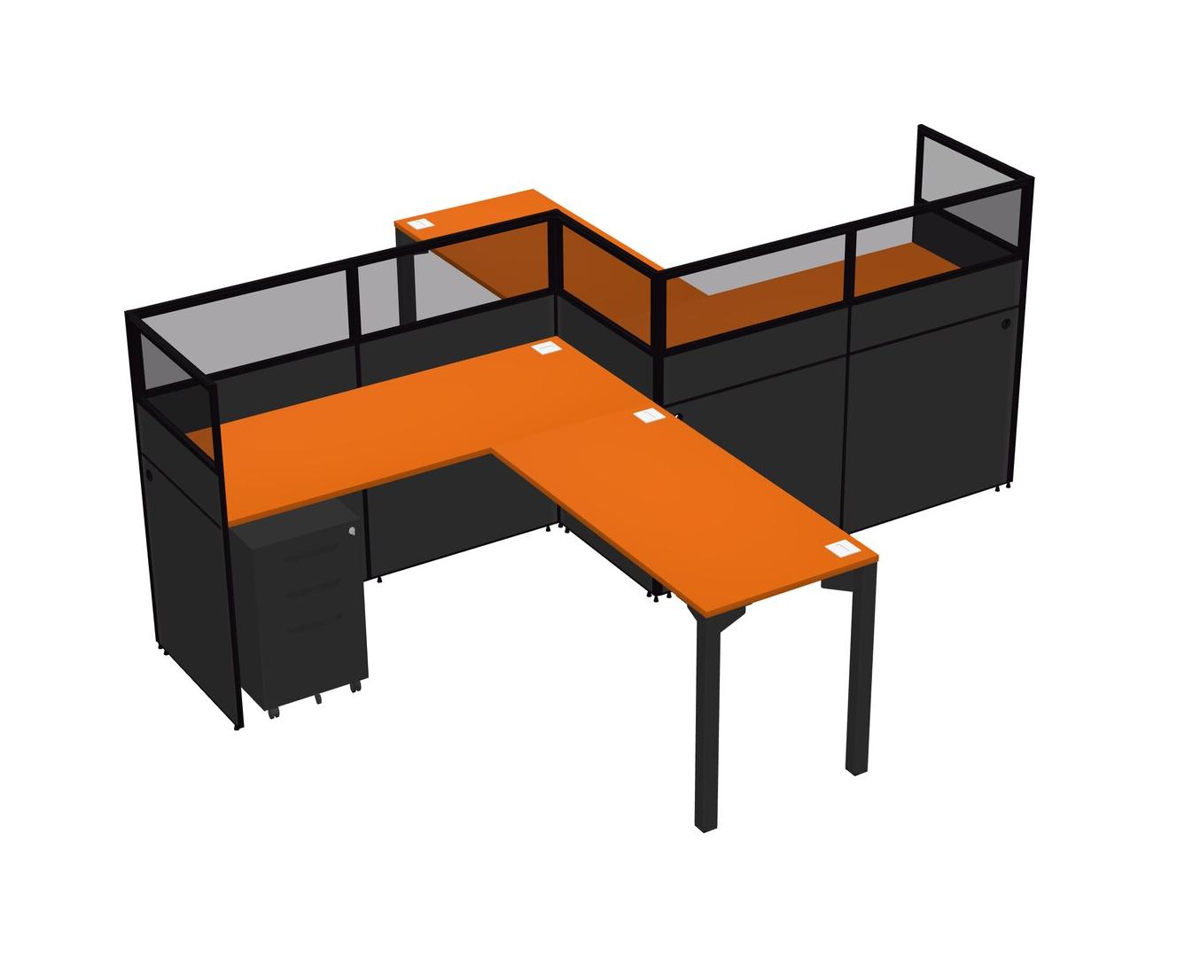 Orange L-shape Cubicle Workstations For 2 - Zigzag Formation + Black Metal Mobile Drawers + Panel Return
