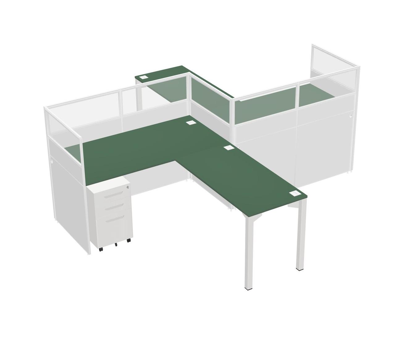 Green L-shape Cubicle Workstations For 2 - Zigzag Formation + White Metal Mobile Drawers + Panel Return