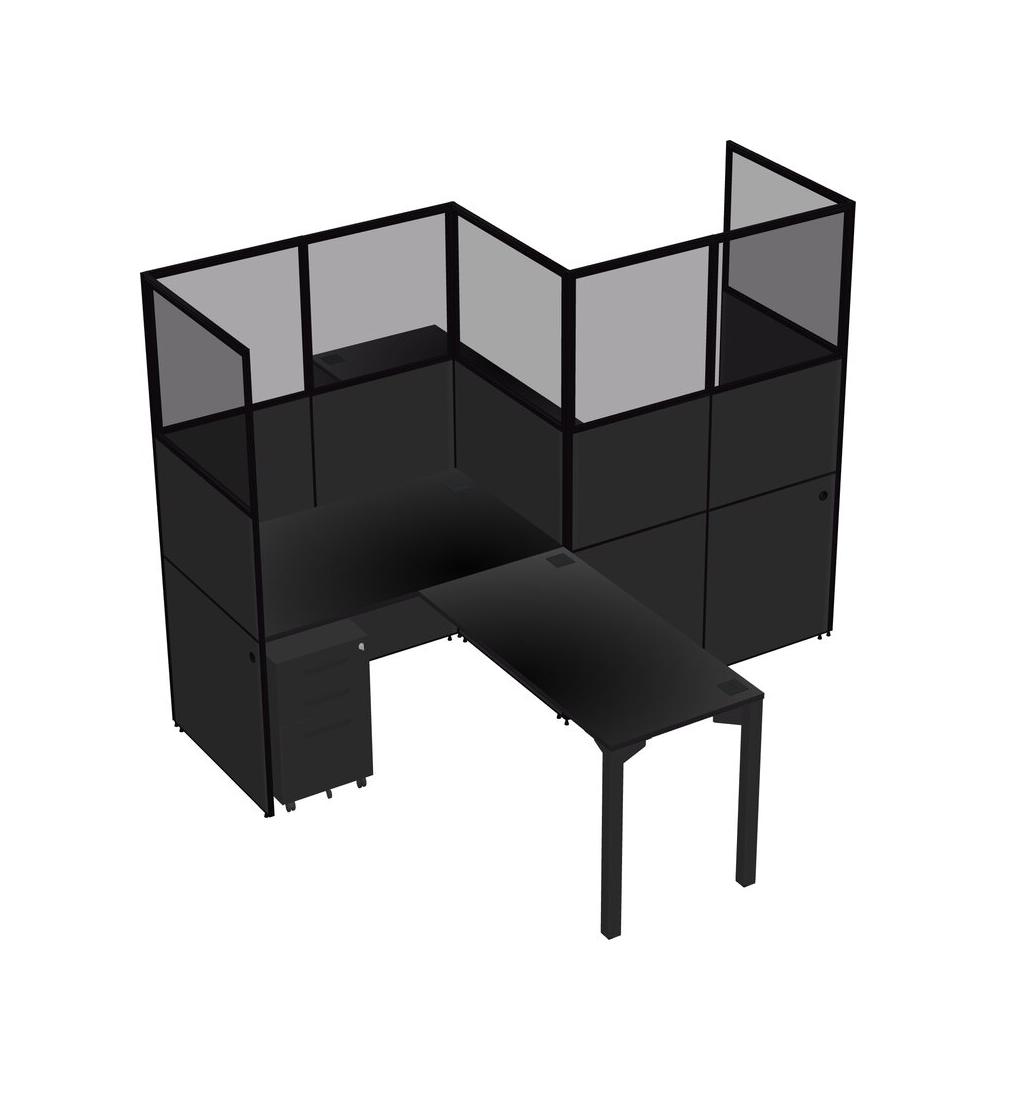 Black L-shape Cubicle Workstations For 2 - Zigzag Formation + Black Metal Mobile Drawers + Panel Return