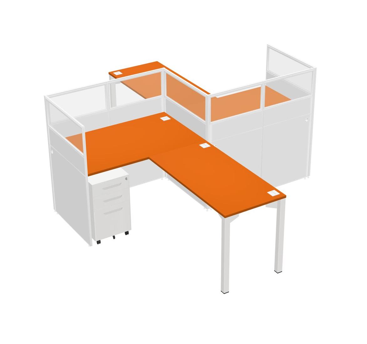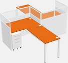 Orange L-shape Cubicle Workstations For 2 - Zigzag Formation + White Metal Mobile Drawers + Panel Return