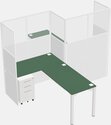 Green L-shape Cubicle Workstations For 2 - Zigzag Formation + White Metal Mobile Drawers + Panel Return