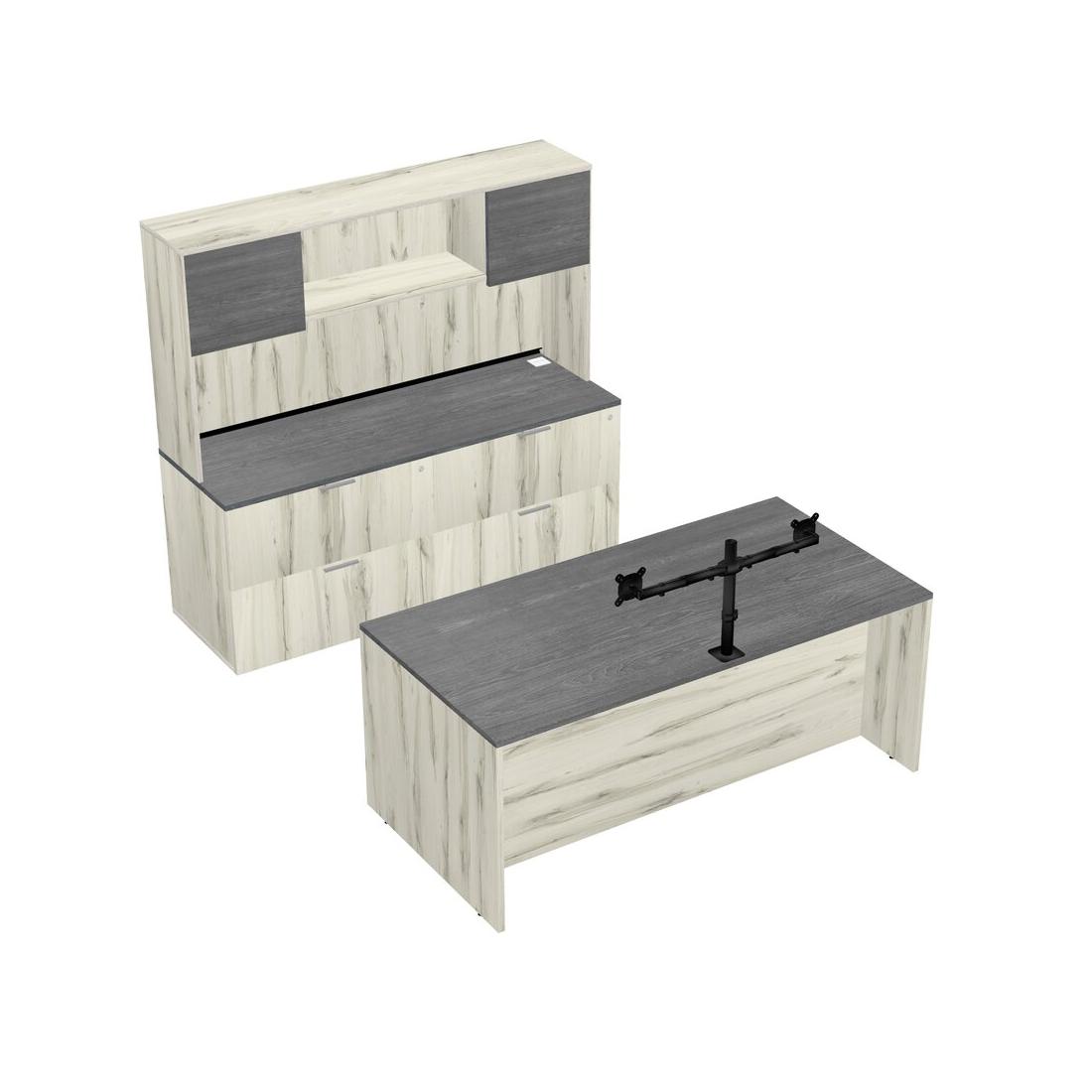 Grey Office Parallel Desk With Lateral File Cabinet + Wooden Mobile Drawers + Hutch + Monitor Arm (double Arms)