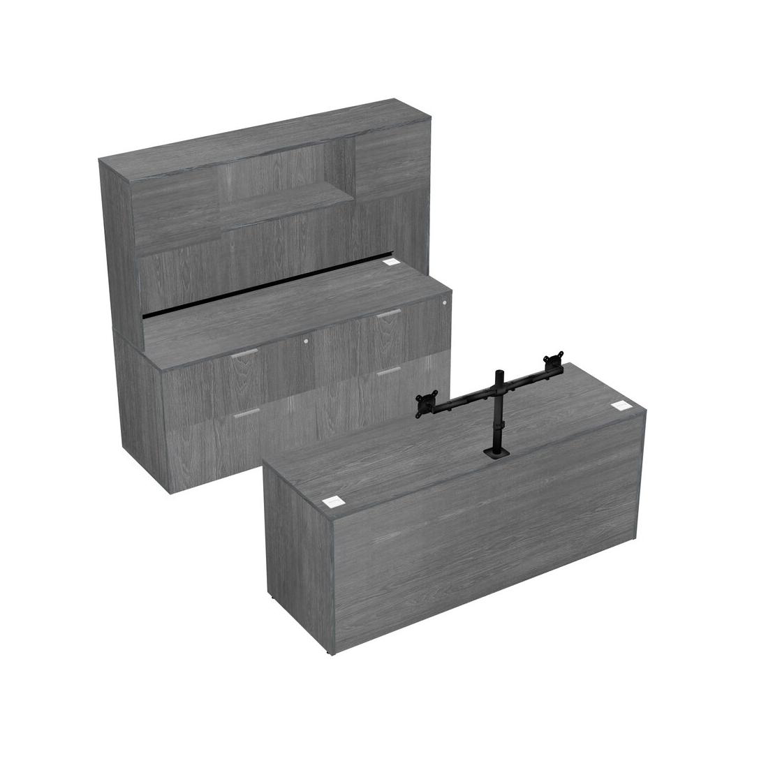 Grey Office Parallel Desk With Lateral File Cabinet + Wooden Mobile Drawers + Hutch + Monitor Arm (double Arms)