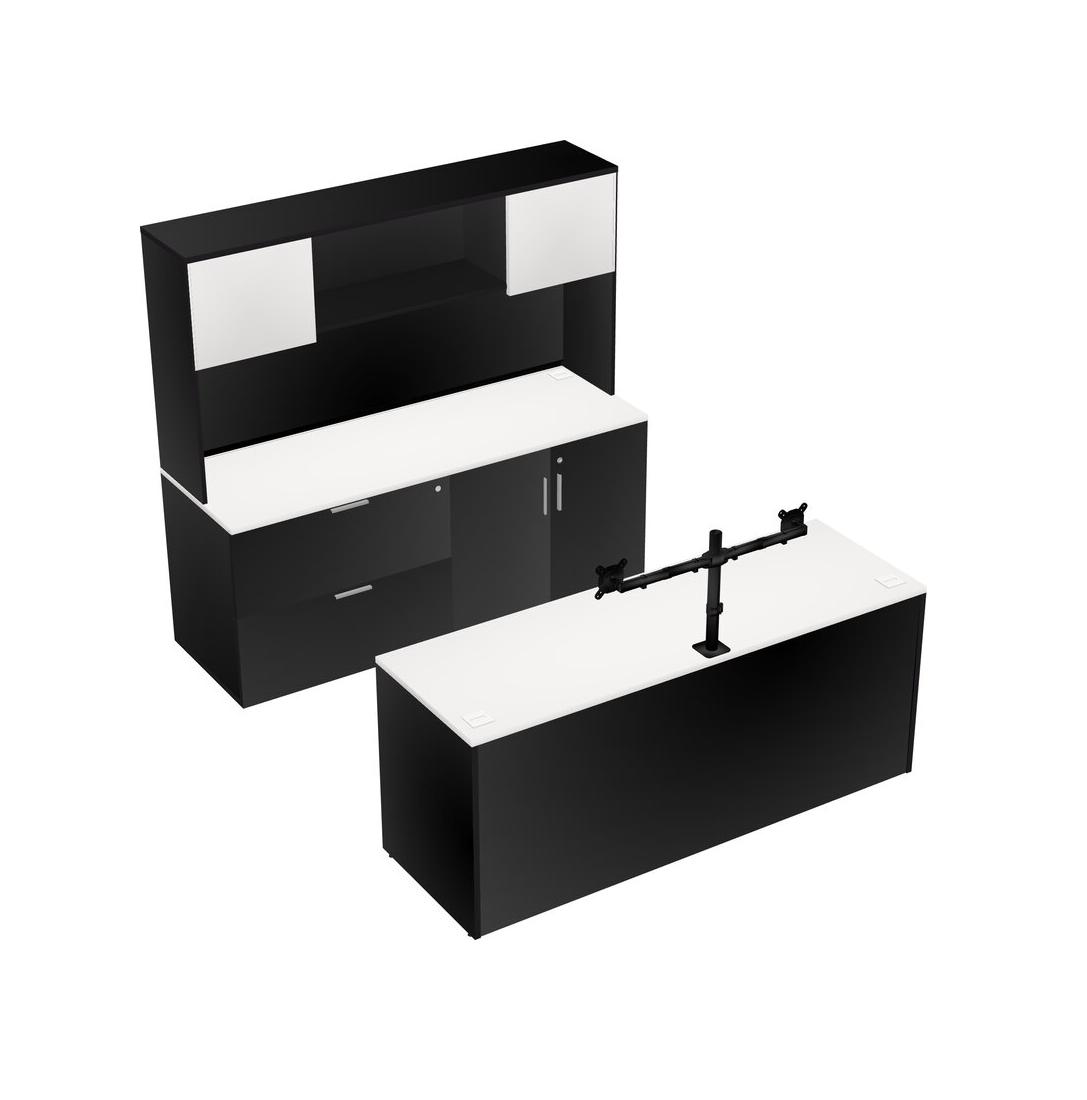 White Office Parallel Desk With Lateral Storage Combo + Wooden Mobile Drawers + Hutch + Monitor Arm (double Arms)