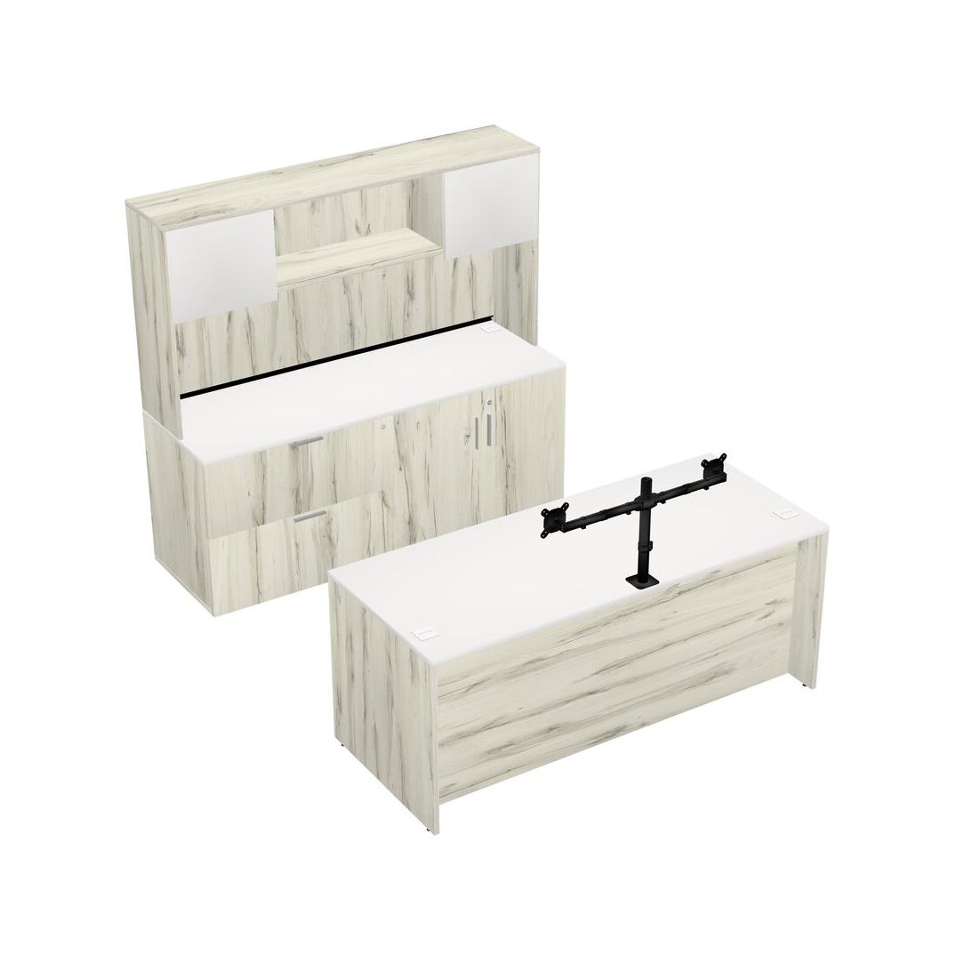 White Office Parallel Desk With Lateral Storage Combo + Wooden Mobile Drawers + Hutch + Monitor Arm (double Arms)