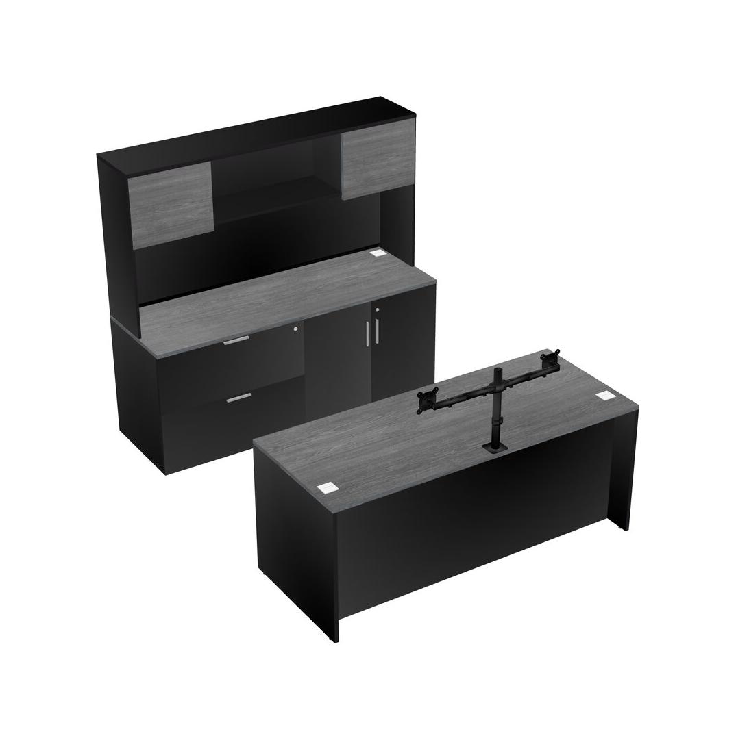 Grey Office Parallel Desk With Lateral Storage Combo + Wooden Mobile Drawers + Hutch + Monitor Arm (double Arms)
