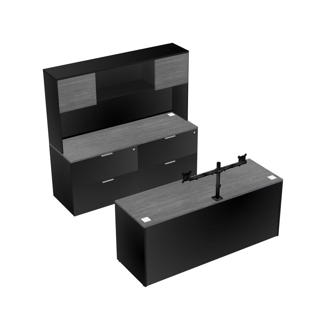 Grey Office Parallel Desk With Lateral File Cabinet + Hutch + Monitor Arm (double Arms)