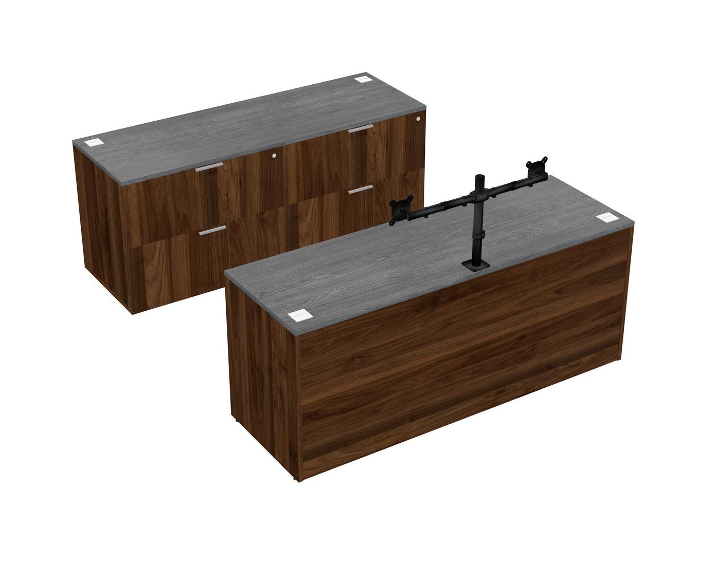 Grey Office Parallel Desk With Lateral File Cabinet + Wooden Mobile Drawers + Monitor Arm (double Arms)