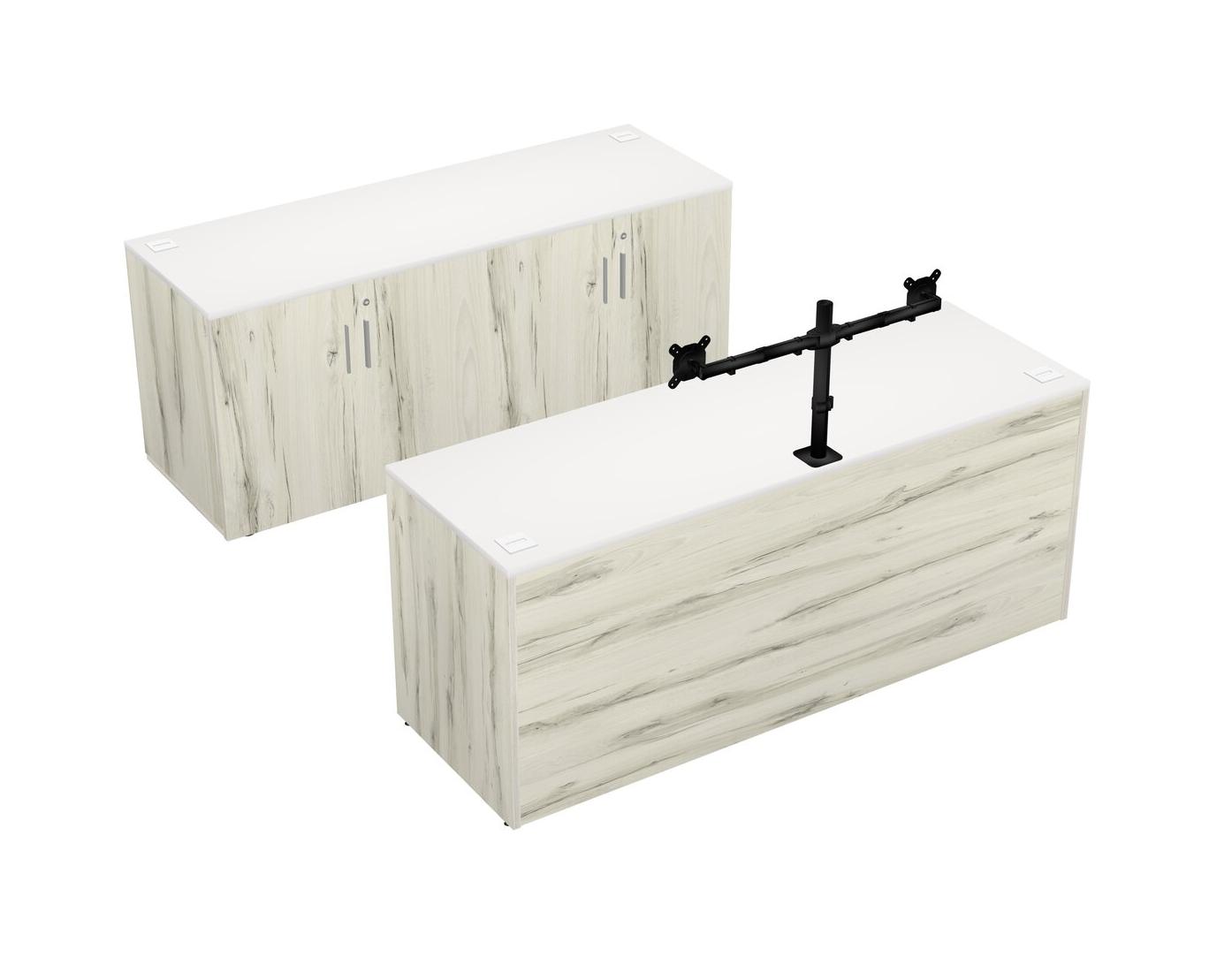 White Office Parallel Desk With Storage Cabinet + Wooden Mobile Drawers + Monitor Arm (double Arms)
