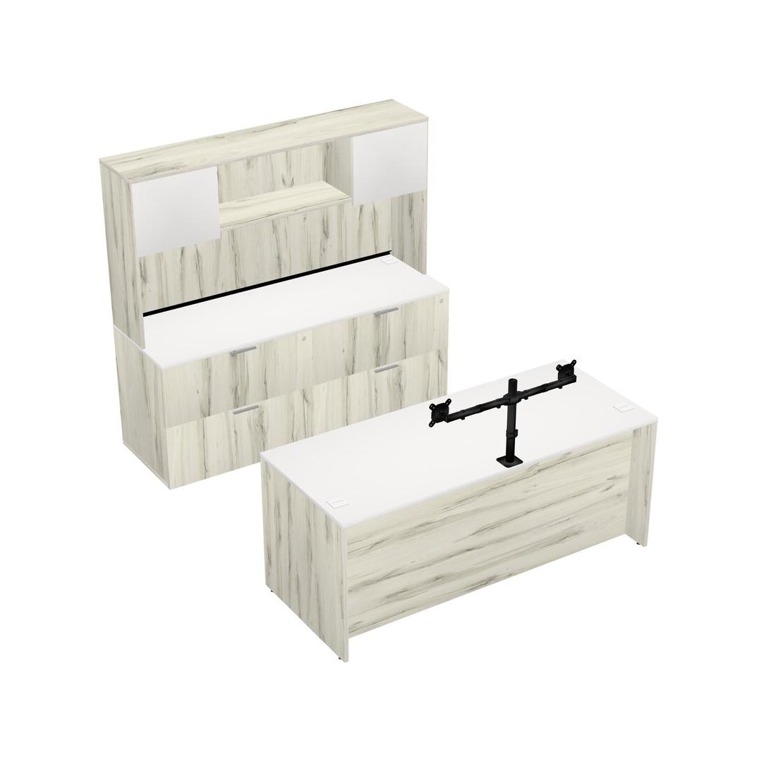 White Office Parallel Desk With Lateral File Cabinet + Hutch + Monitor Arm (double Arms)
