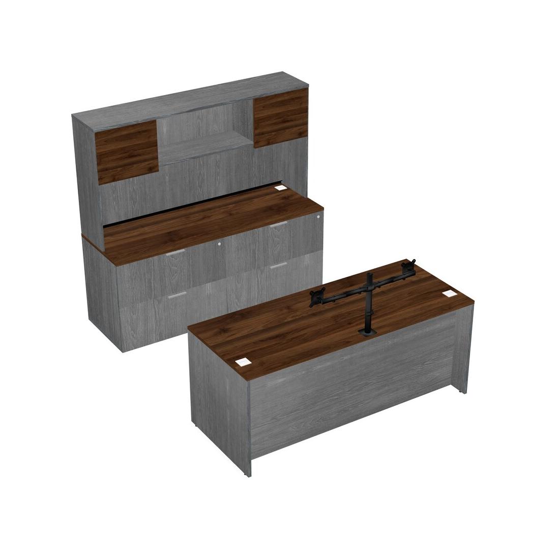 Columbia Walnut Office Parallel Desk With Lateral File Cabinet + Hutch + Monitor Arm (double Arms)